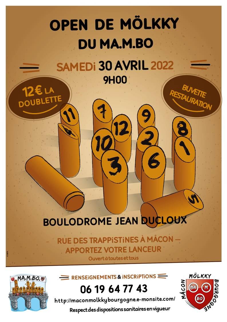 L'open de mölkky du MA.M.BO aura lieu le samedi 30 avril 2022 à 9H au boulodrome Jean Ducloux à Mâcon. Limité à 48 doublettes.