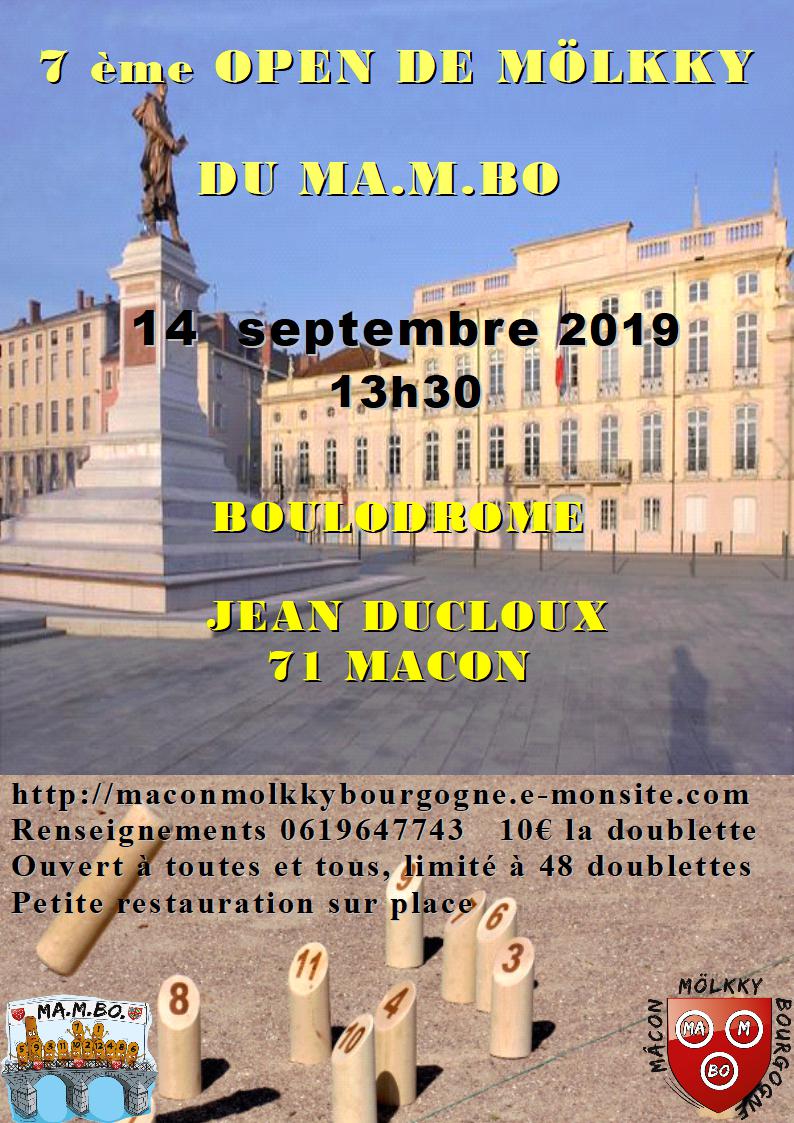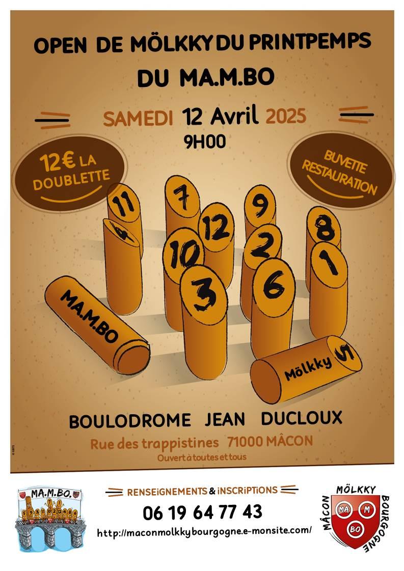 Toute l'équipe du MA.M.BO est heureuse de vous accueillir le samedi 23 mars 2019 à 13h30 au boulodrome Jean Ducloux "Les trappistines" 31 Rue Pillet 71000 MACON pour son 5ème open de mölkky. Renseignements au 06 19 64 77 43.