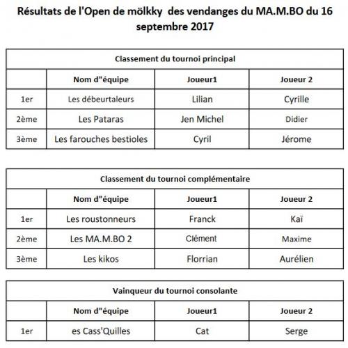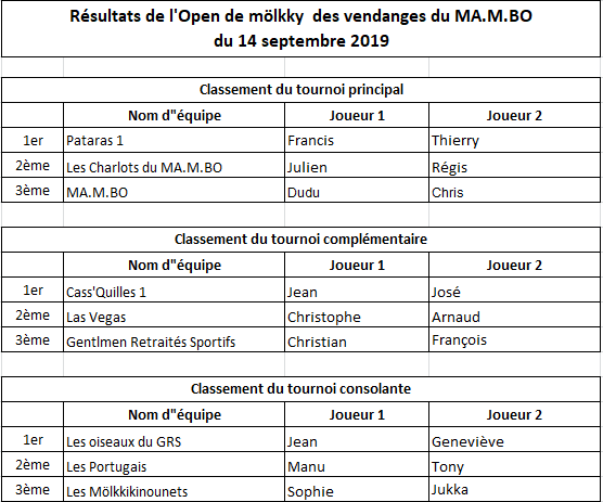 Résultats de l'Open de mölkky des vendanges du MA.M.BO du 15 septembre 2018 |