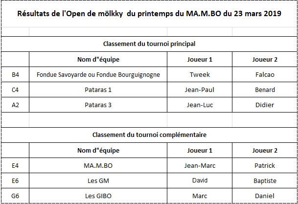 Toute l'équipe du MA.M.BO remercie l'ensemble des personnes pour leur participation à notre open du printemps. Merci aux membres du MA.M.BO qui ont œuvré pour que cette belle journée soit des plus conviviale. Tweek et Falcao de la Mölkky Family ont encore frappé. Bravo!